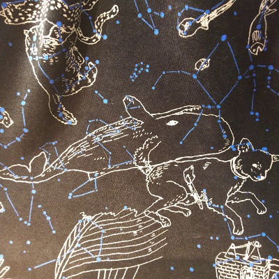 冬の星座が描かれたワンピース!光沢感のあるベロア生地にプリントされているので、上品なイメージがあります。 バンドカラーなので首元すっきり。ウエストの紐の絞り具合でいろんな表情を見せてくれます。